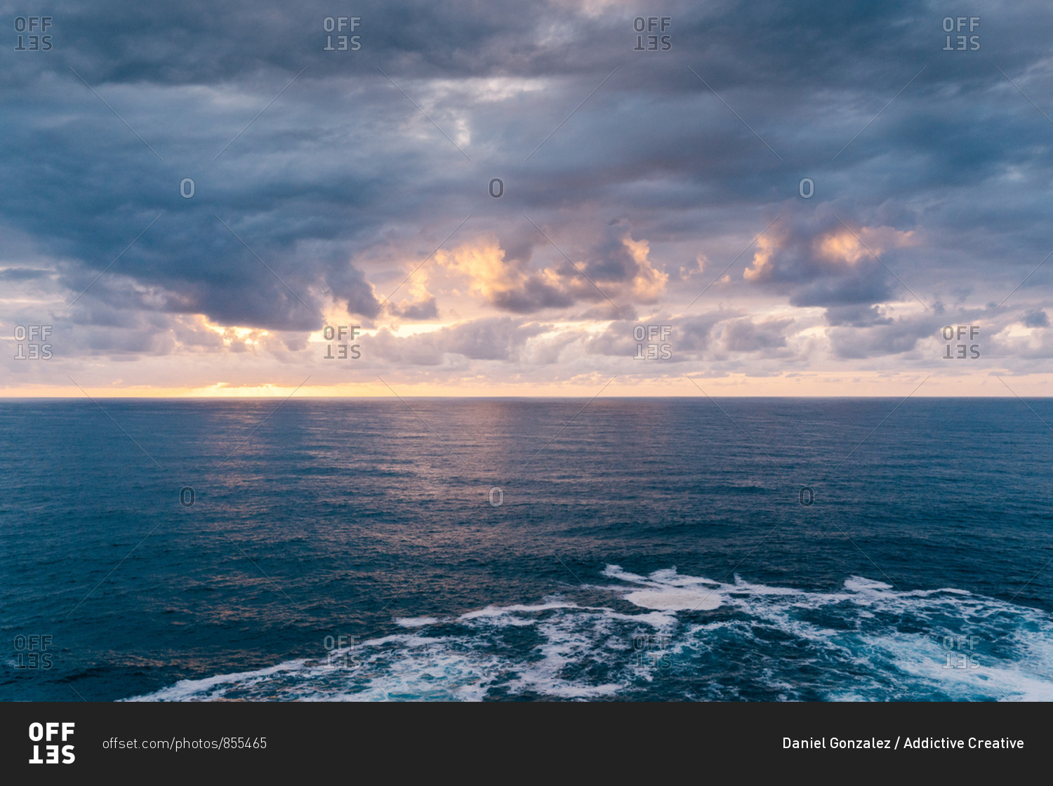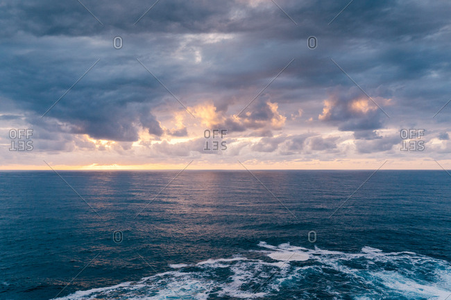 Overcast sundown sky over stormy sea with foamy waves in evening in nature