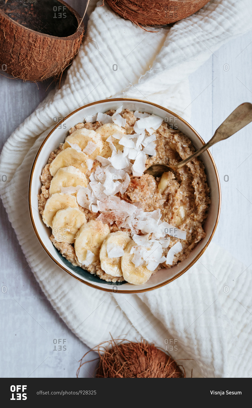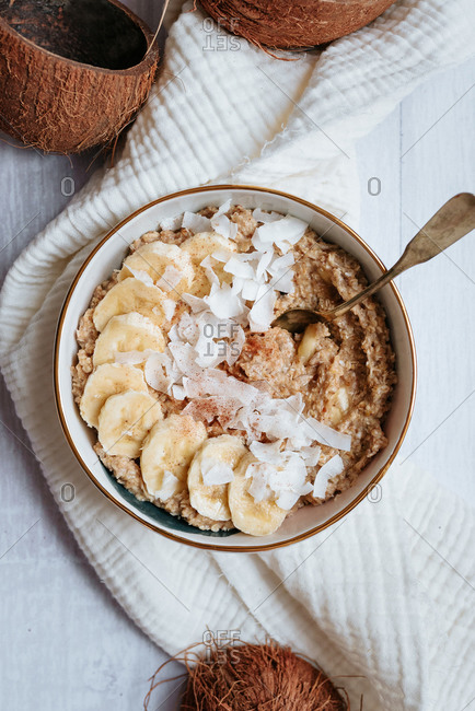 Overhead view of a bowl of coconut and banana oat meal