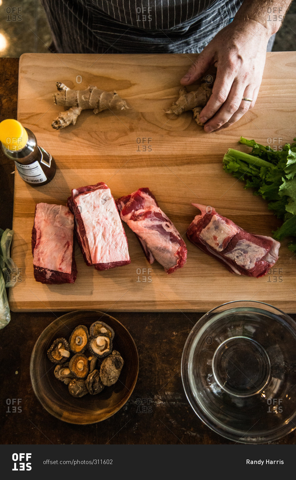 Overhead view of chef preparing short ribs with ginger