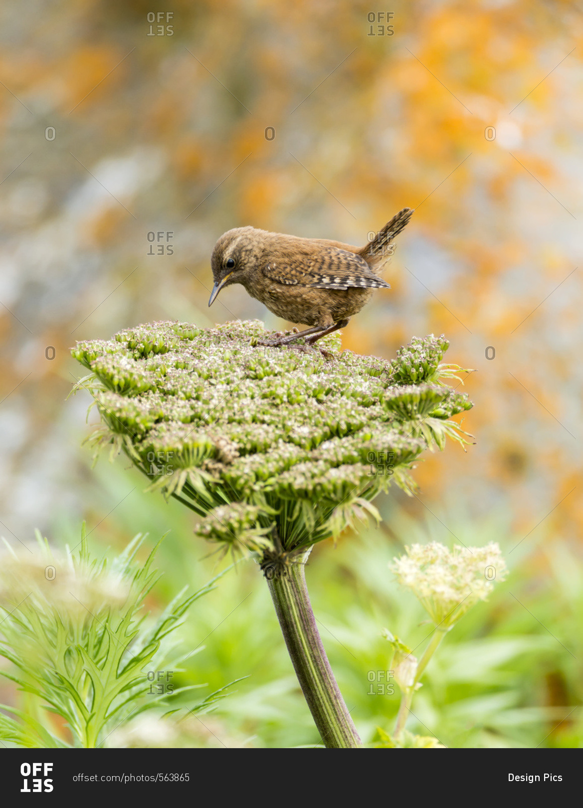 Pacific wren (Troglodytes pacificus) perched on wild celery on St. Paul Island in Southwest Alaska, St. Paul Island, Pribilof Islands, Alaska, United States of America