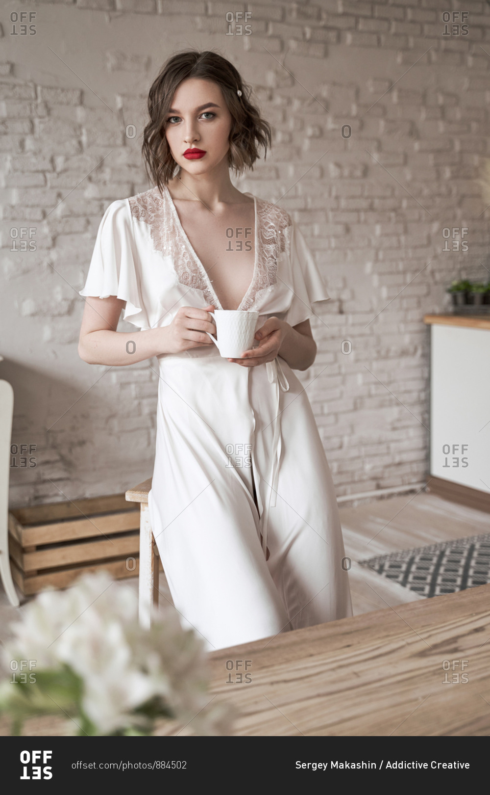 Pensive woman looking away and contemplating while having hot drink in kitchen