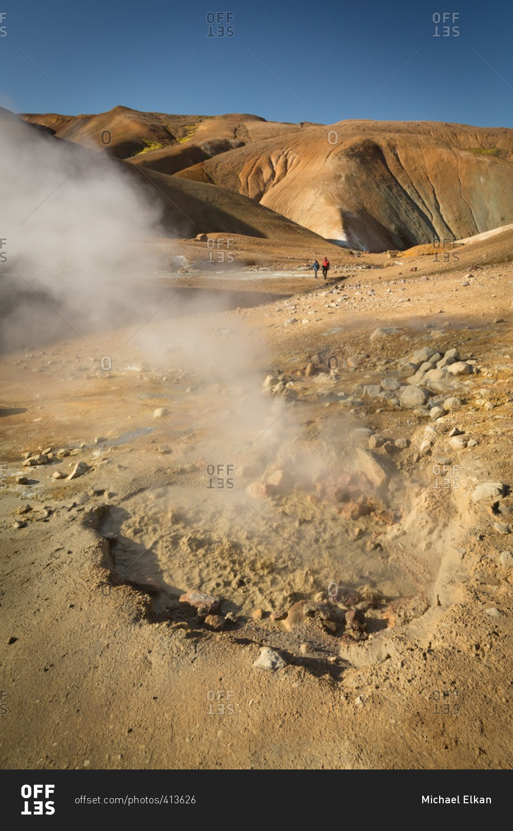 People hiking in Icelandic geothermal area in the remote Kjoslur highlands