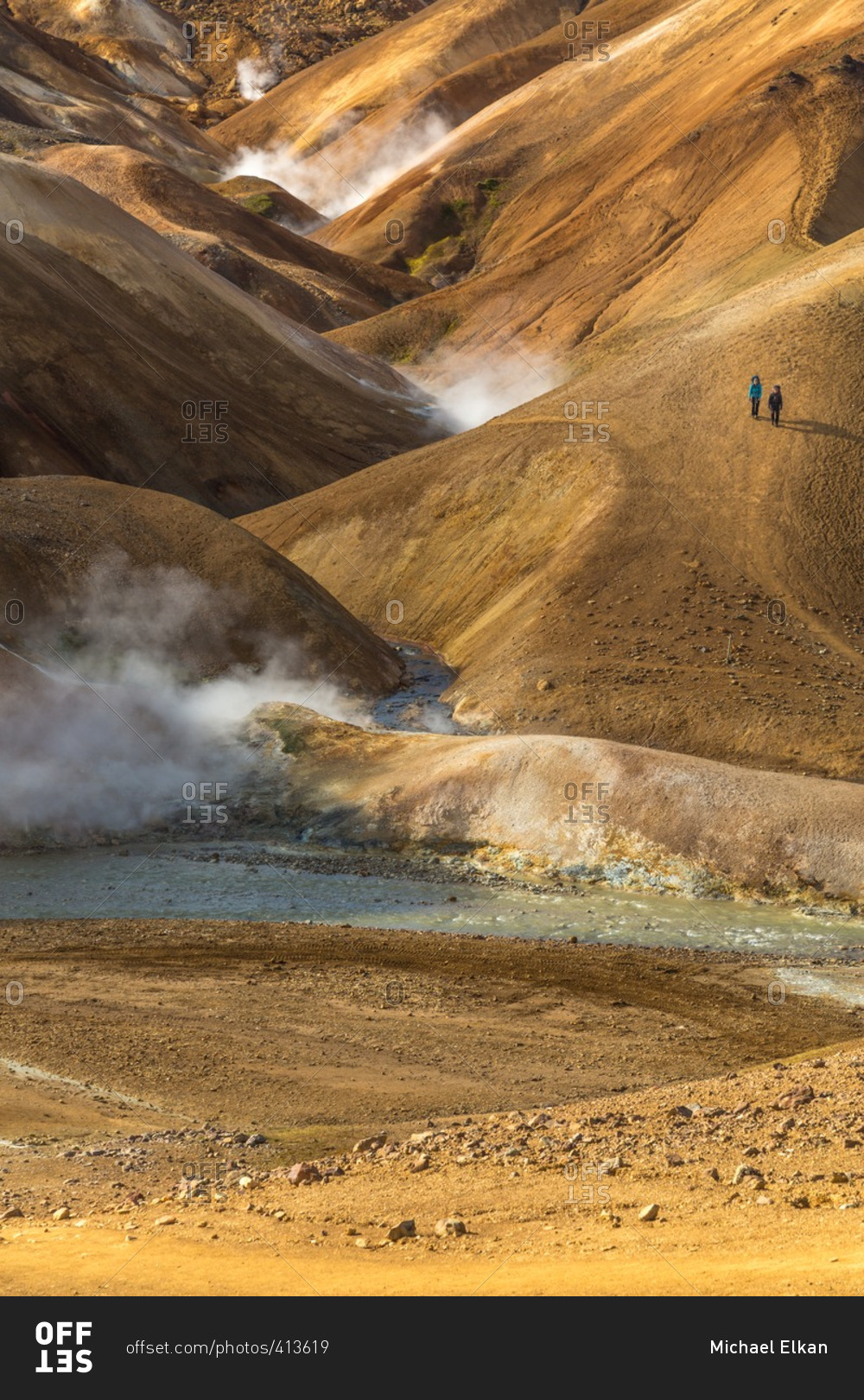 People hiking in the Icelandic geothermal landscape in the remote Kjoslur highlands