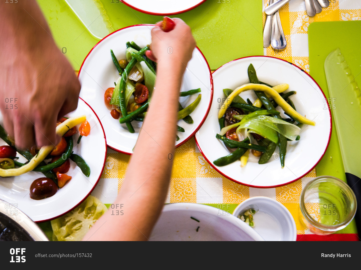 People preparing a green bean and tomato salad