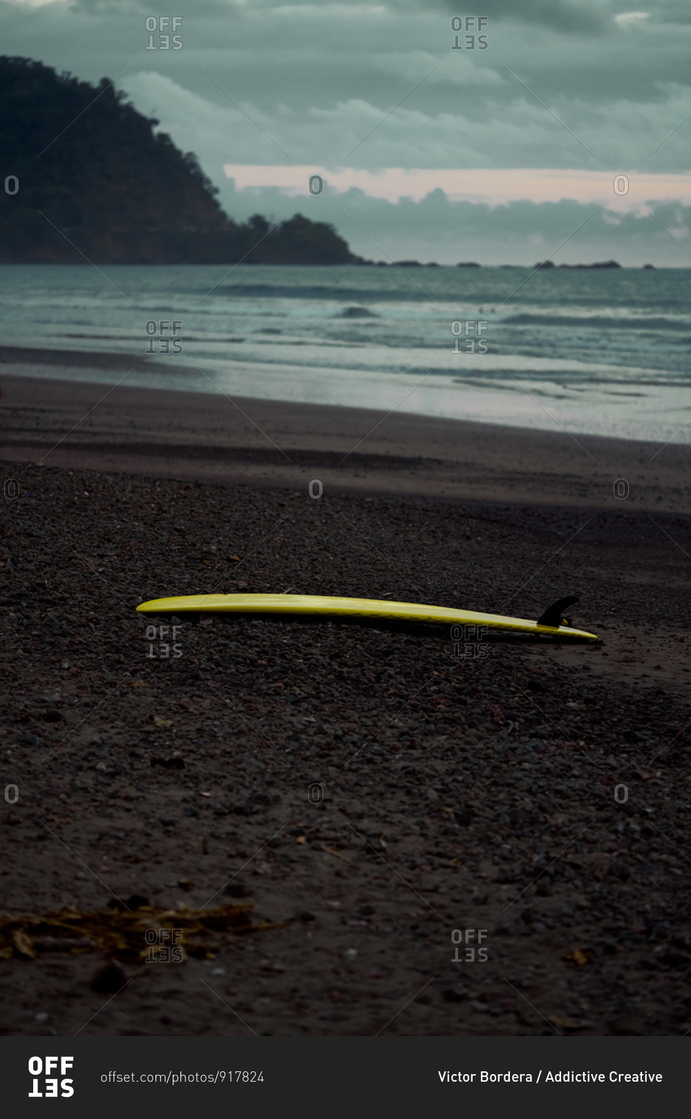 Picturesque scenery of surfboard on sandy beach in twilight in Costa Rica