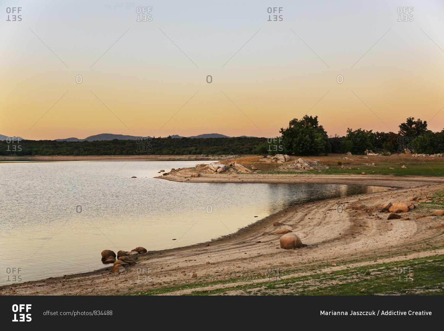 Picturesque view of lake with countryside route, fir forest and hills in Valmayor Lake Spain