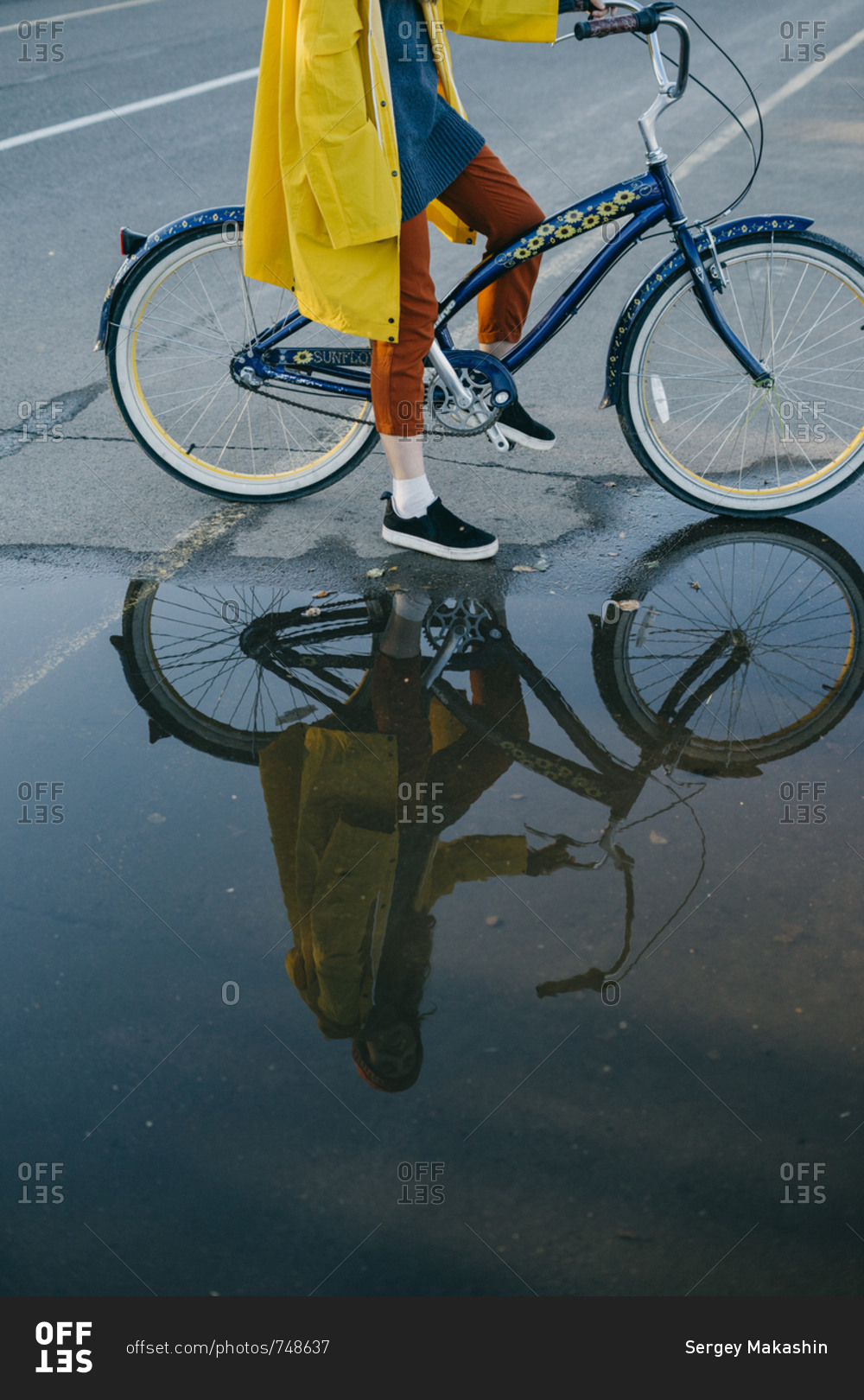 Portrait of a beautiful young woman in a yellow raincoat and knitted hat standing near a large puddle while on her retro bike