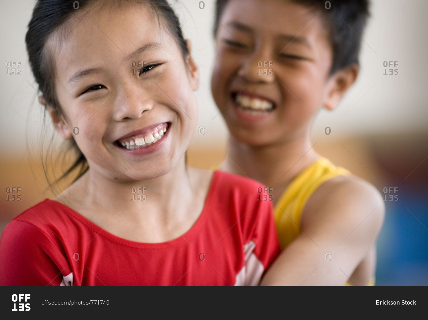 Portrait of a girl being hugged by a boy in a gym.