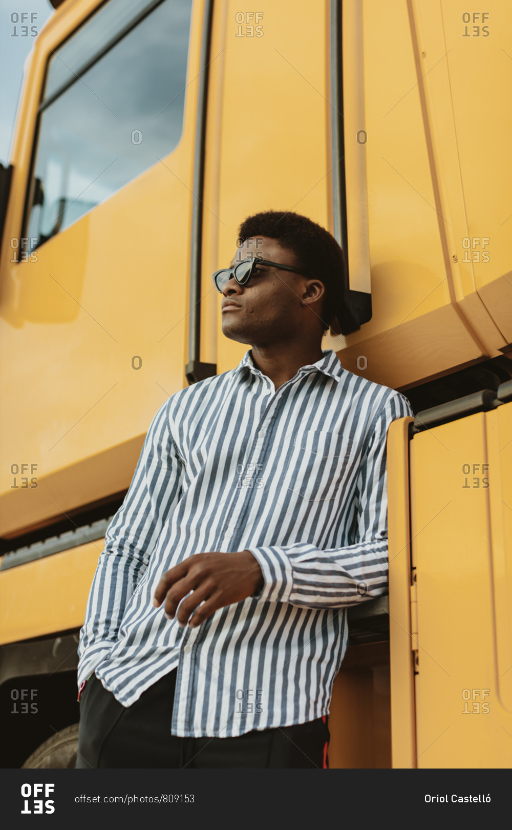 Portrait of a stylish black man wearing blue striped collared shirt leaning on a large yellow vehicle