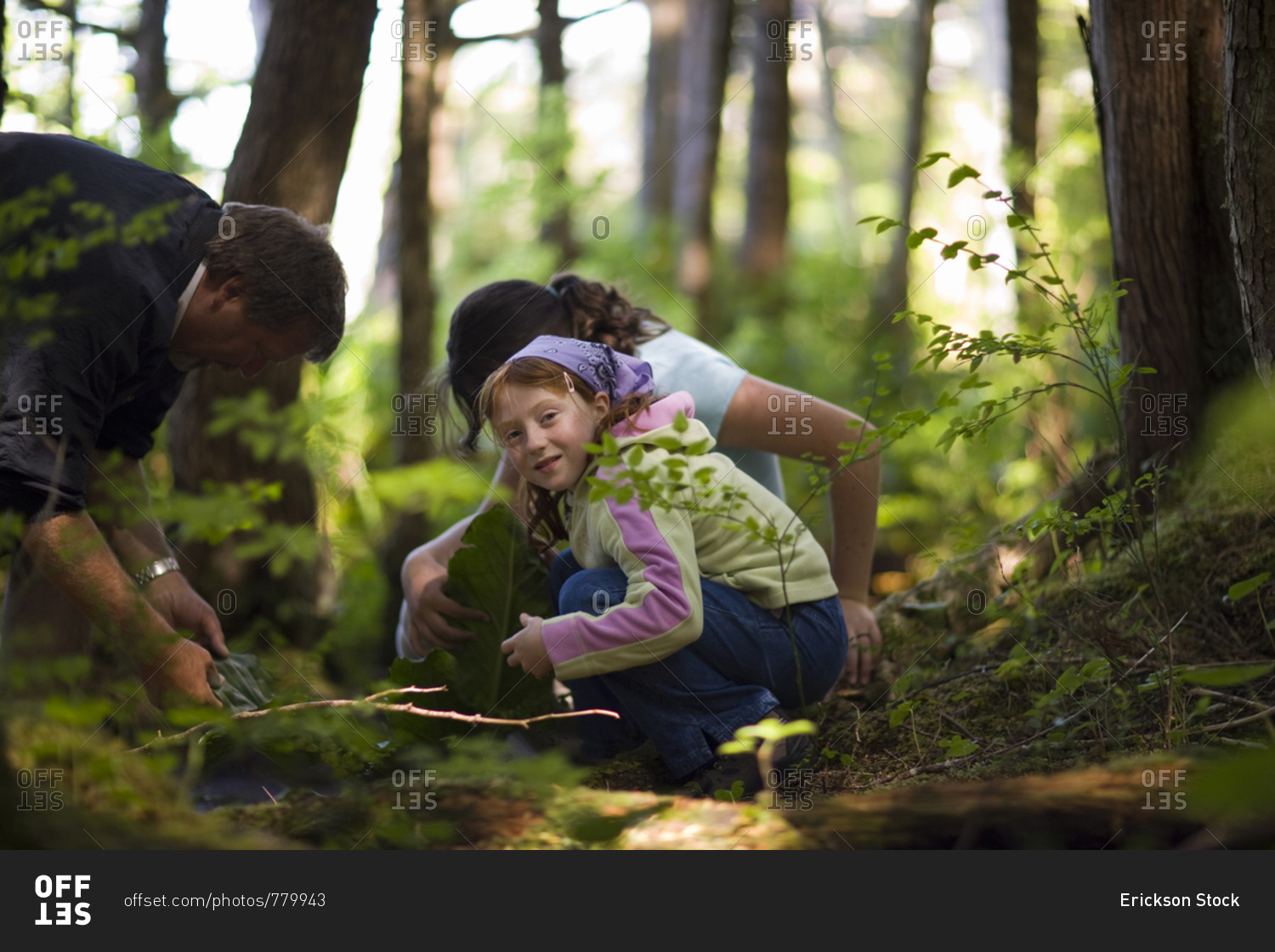 Portrait of a young girl with her teenage sister and mid-adult father gathering leaves while in the forest.