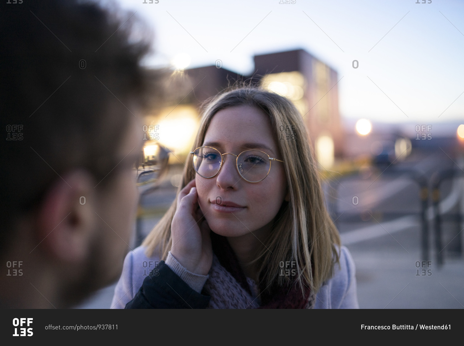 Portrait of blond young woman face to face with her boyfriend at evening twilight