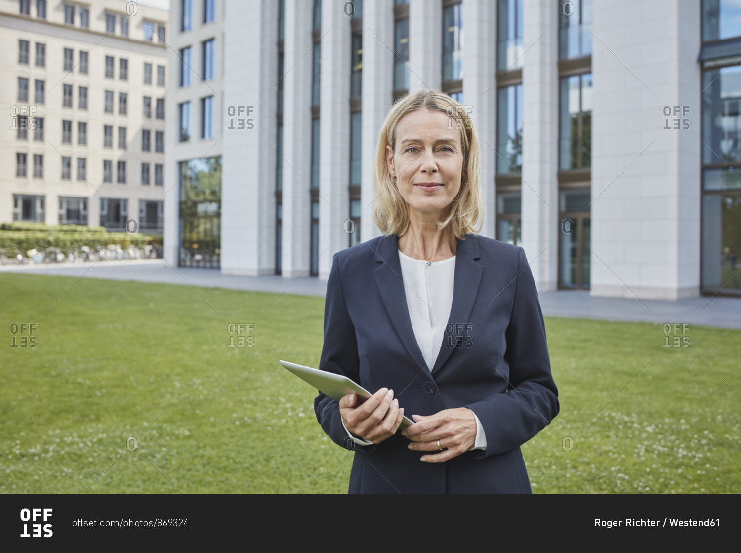 Portrait of confident businesswoman with tablet standing on lawn in the city