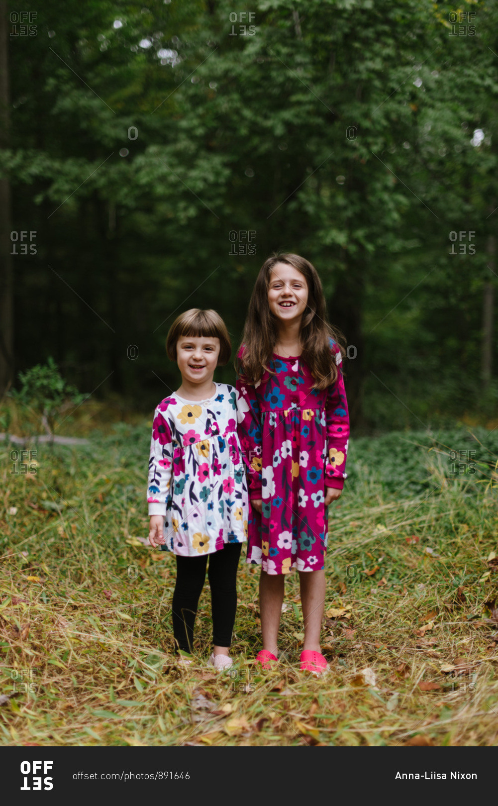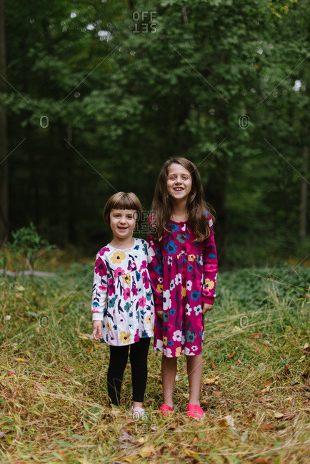 Portrait of happy sisters in coordinating floral dresses in the woods