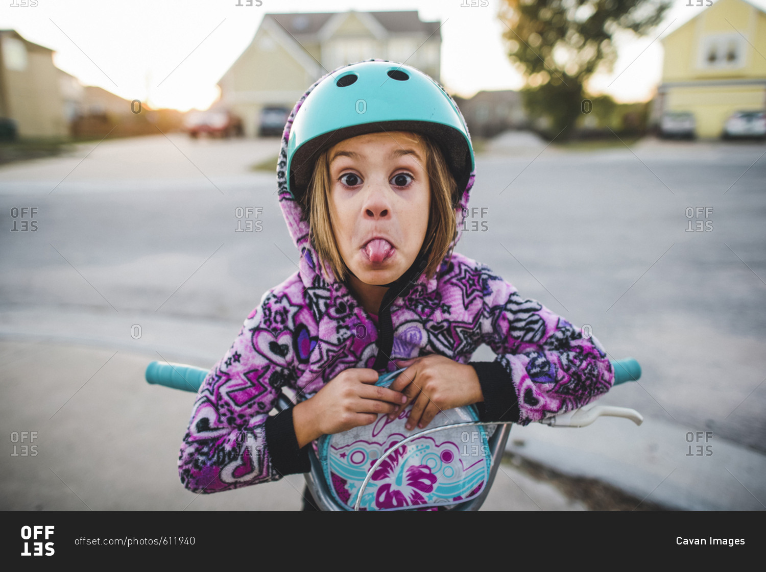 Portrait of playful girl sticking out tongue while riding push scooter on footpath
