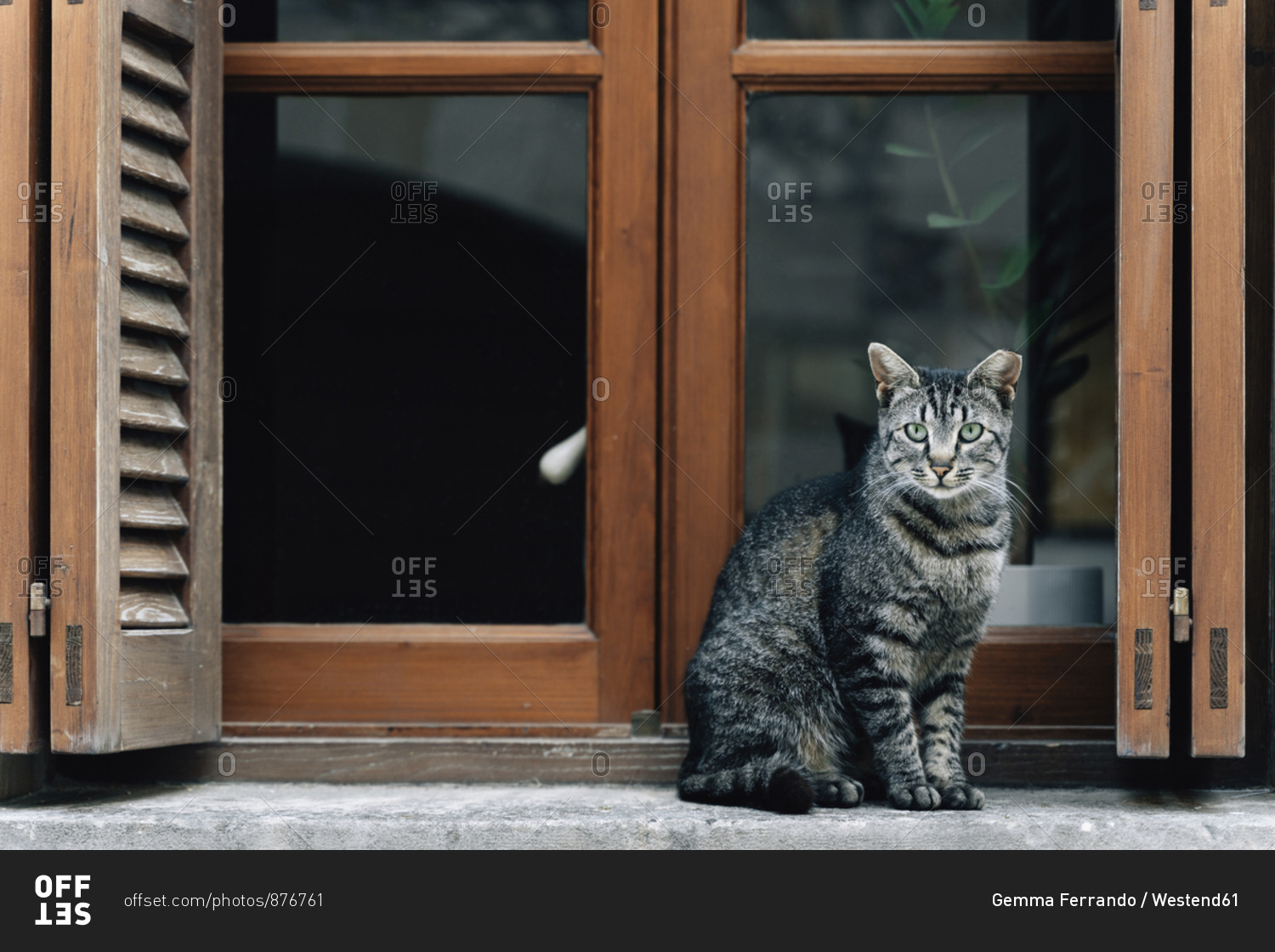 Portrait of tabby cat sitting on window sill