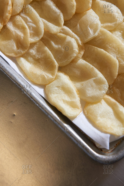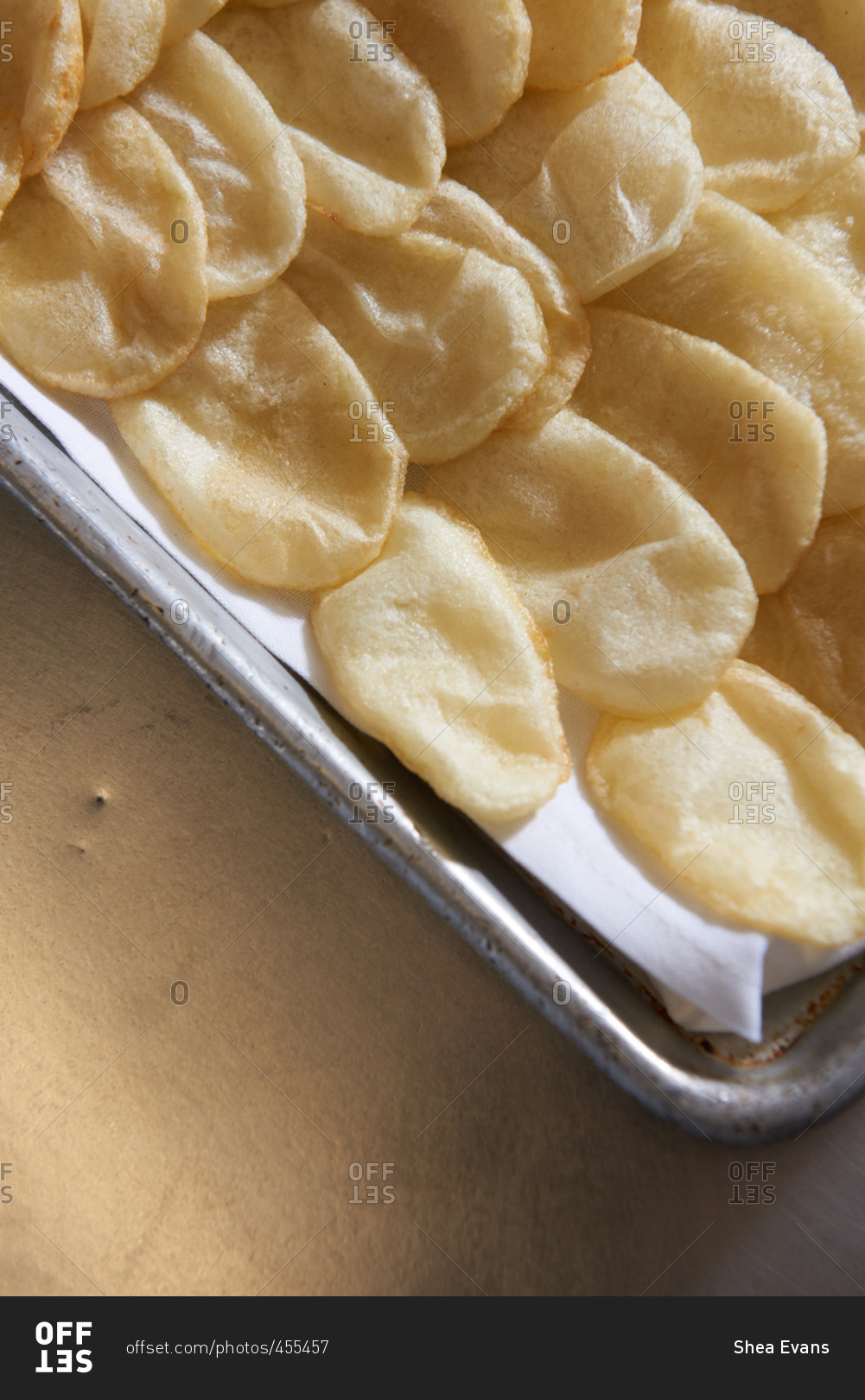 Preparation pan of Pommes De Terre Souffles, a puffed traditional French fry prepared in an upscale French restaurant in Incline Village, Nevada, Lake Tahoe.