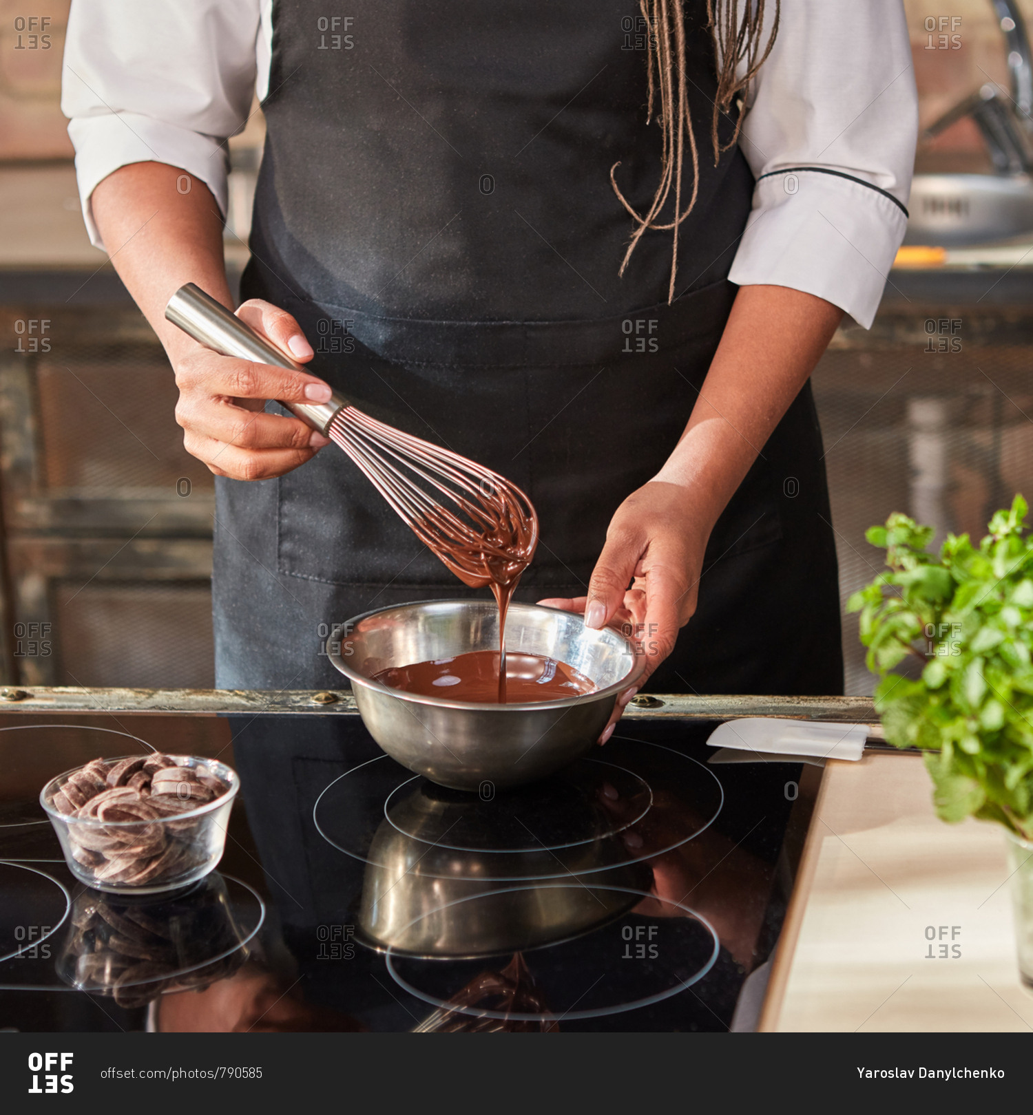 Professional confectioner's mix and warm melted chocolate on a hob for preparation homemade sweets at the kitchen table. Step by step process of chocolate preparing