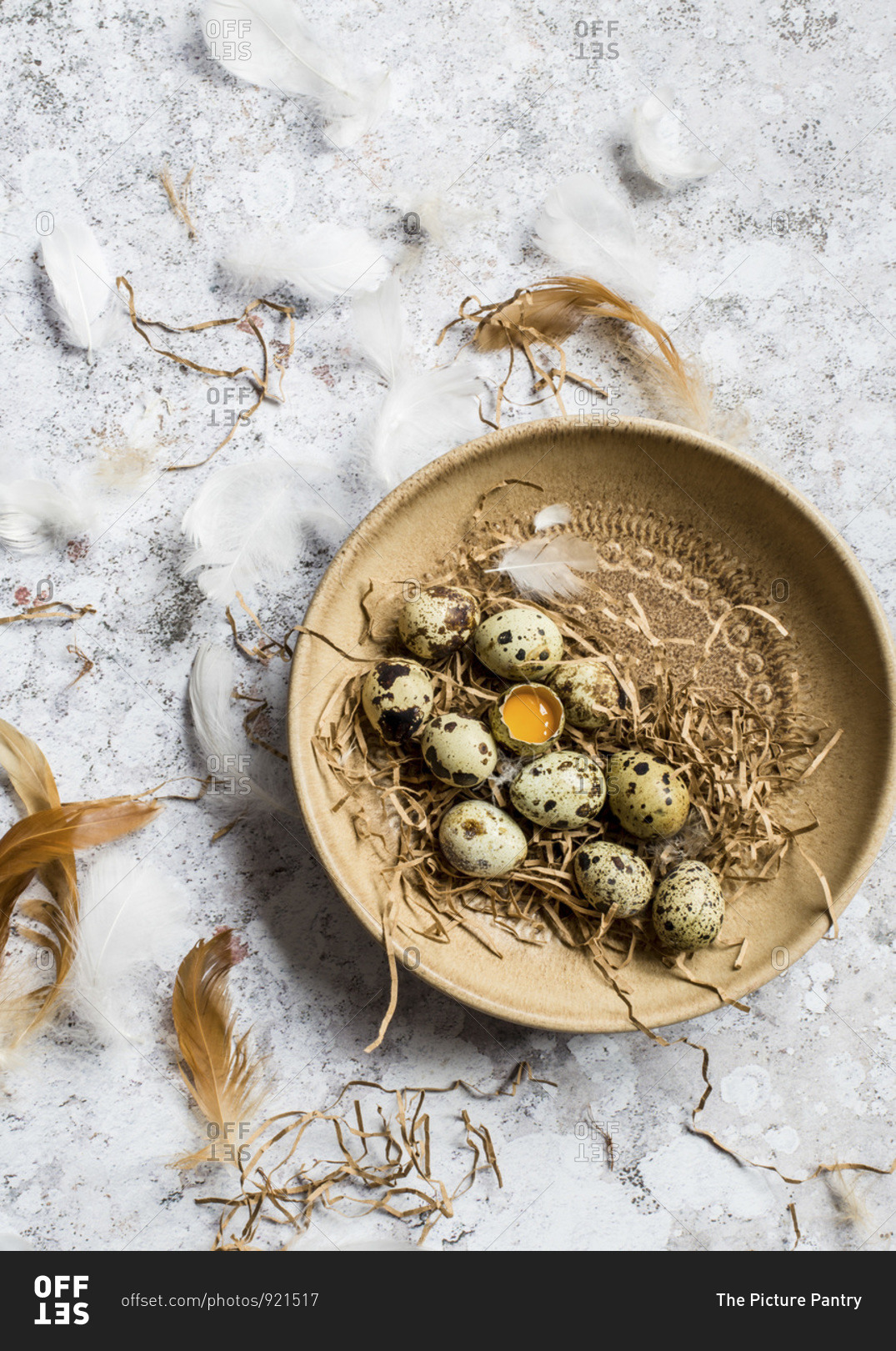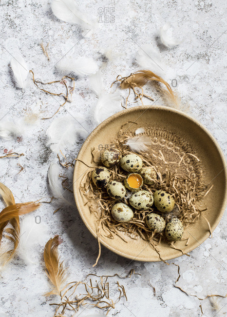 Quail eggs in a brown ceramic bowl, one egg is cracked open, and feathers are around the bowl.
