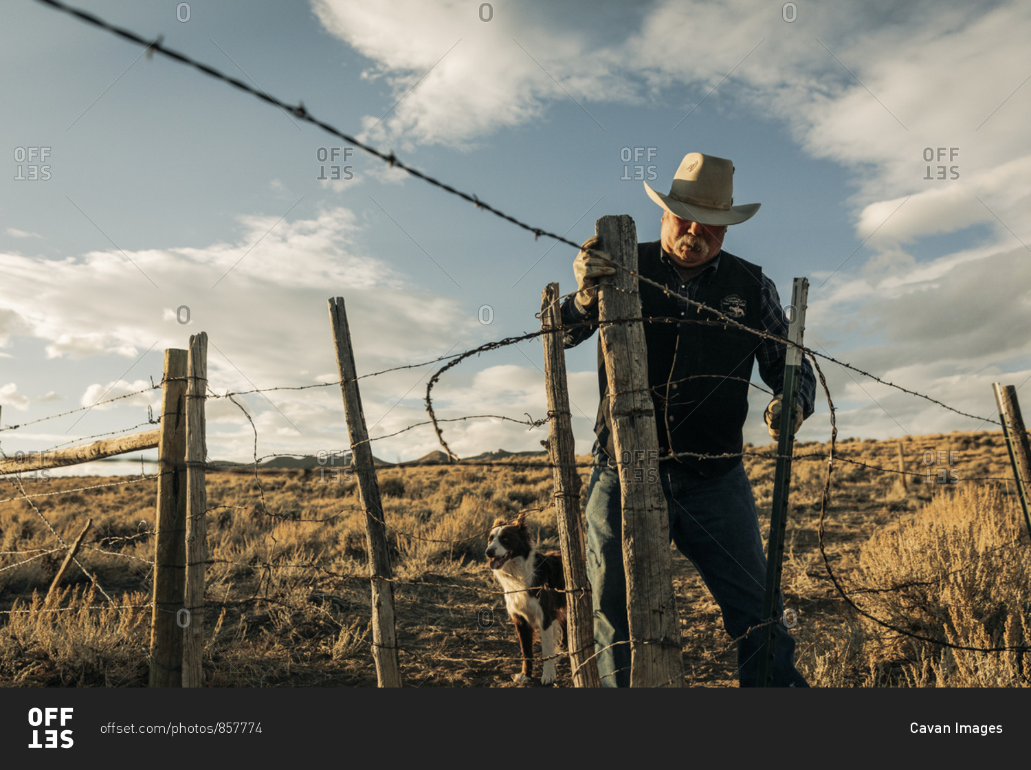 Rancher fixing barbed wire fence with border collie dog