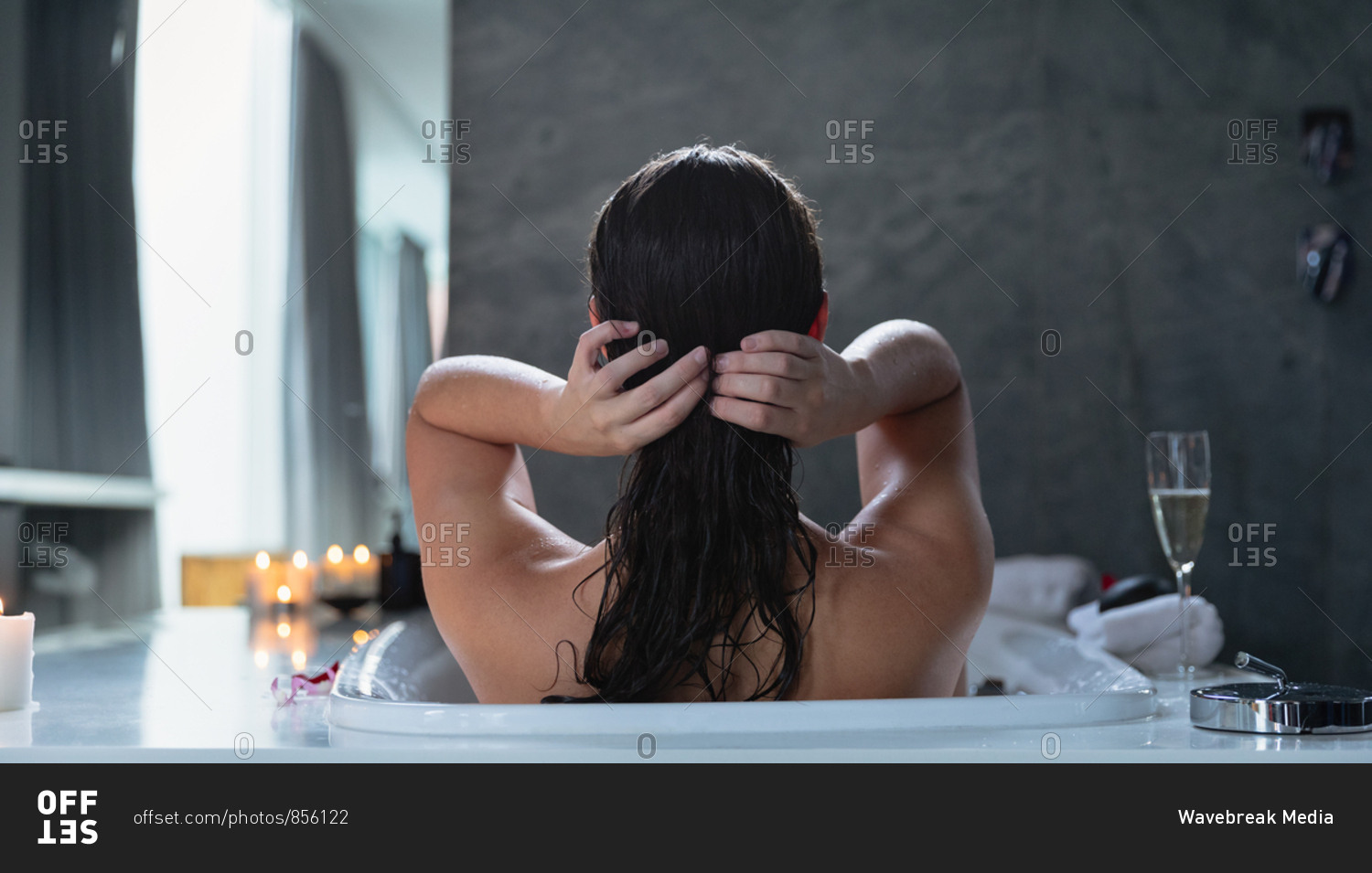 Rear view of a young Caucasian brunette woman sitting in a bath with lit candles and a glass of champagne on the side, adjusting her hair