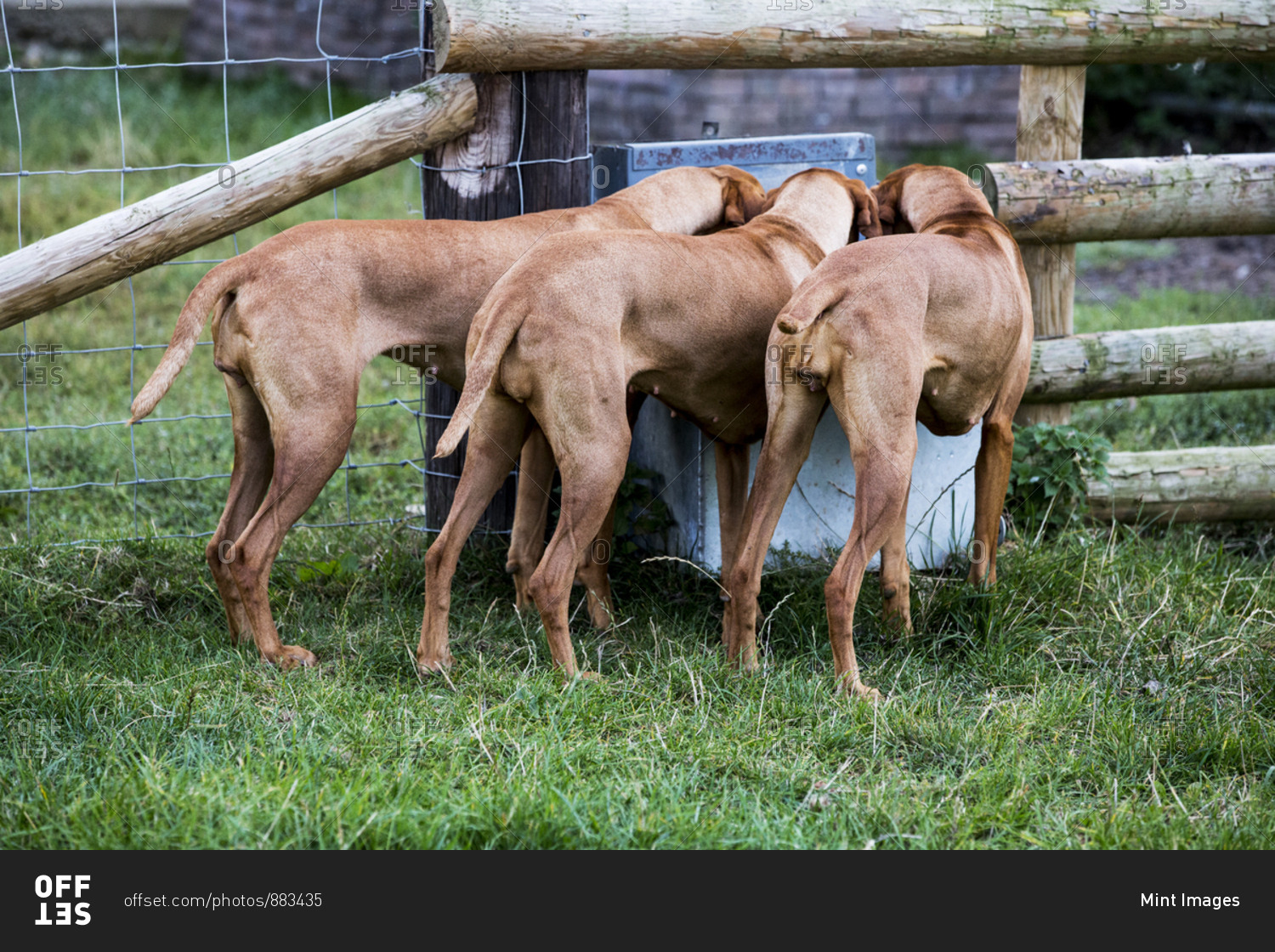 Rear view of three Viszla dogs drinking from a trough.