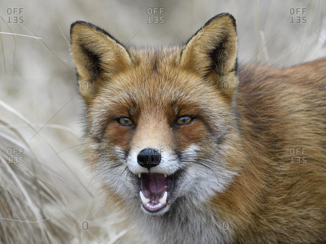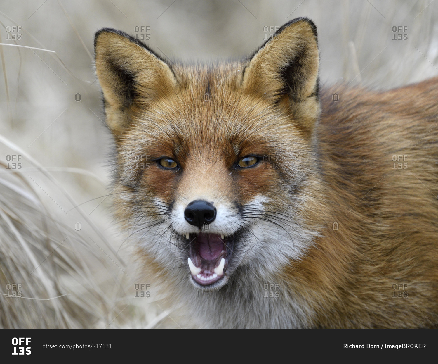 Red fox (Vulpes vulpes), with open mouth and erect ears, animal portrait, Waterleidingduinen, North Holland, Netherlands