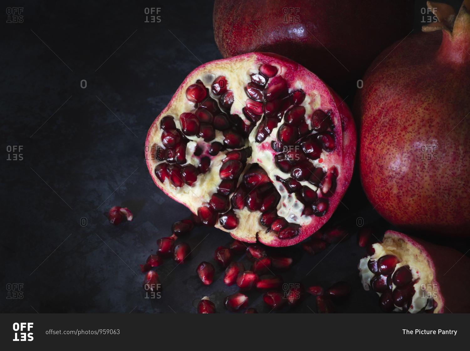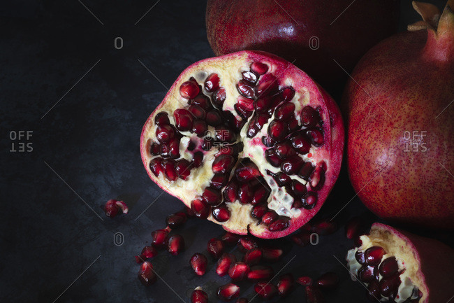 Red seeds inside a cut pomegranate.
