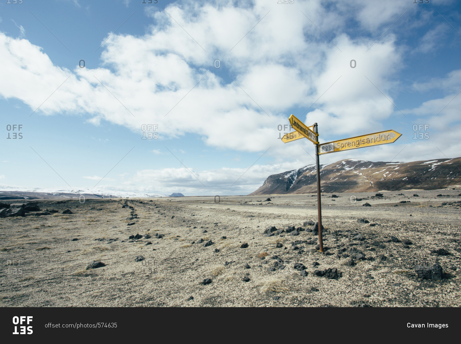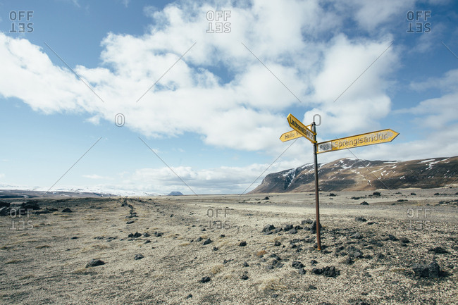 Road sign on arid landscape against cloudy sky during sunny day
