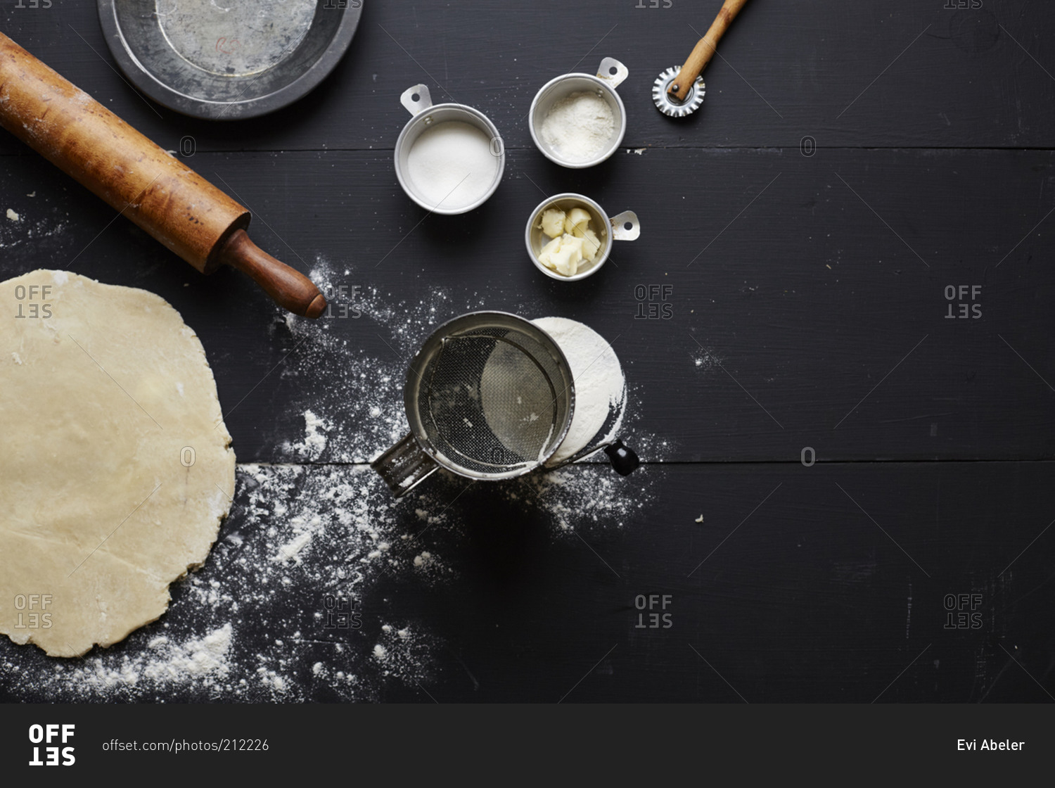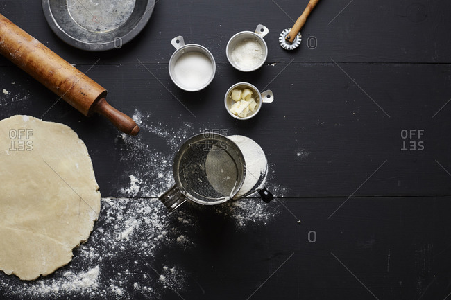 Rolled out raw pie dough and pie supplies
