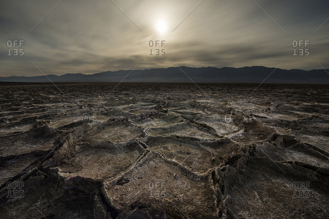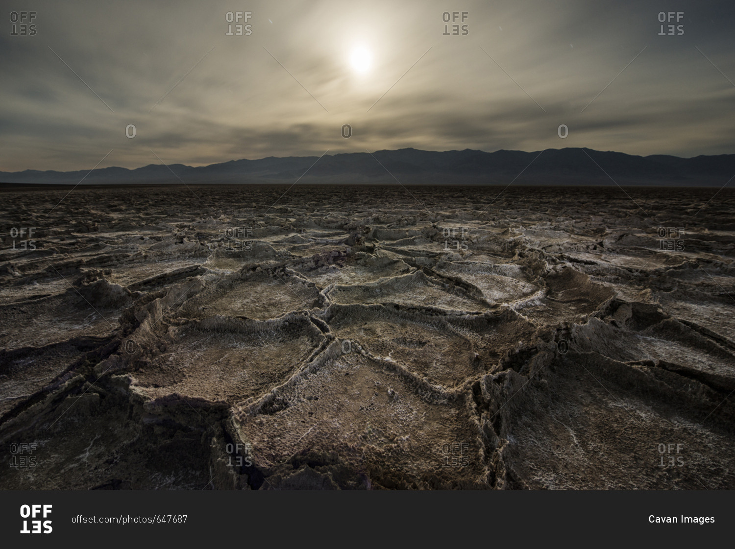 Scenic view of arid landscape against cloudy sky at Death Valley National Park