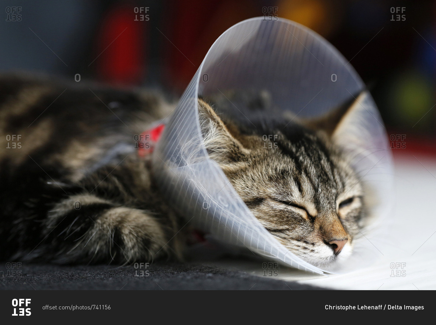 Seine et Marne. Kitten aged 6 months, Norwegian race, coming to be sterilized, wearing a collar, sleeping.