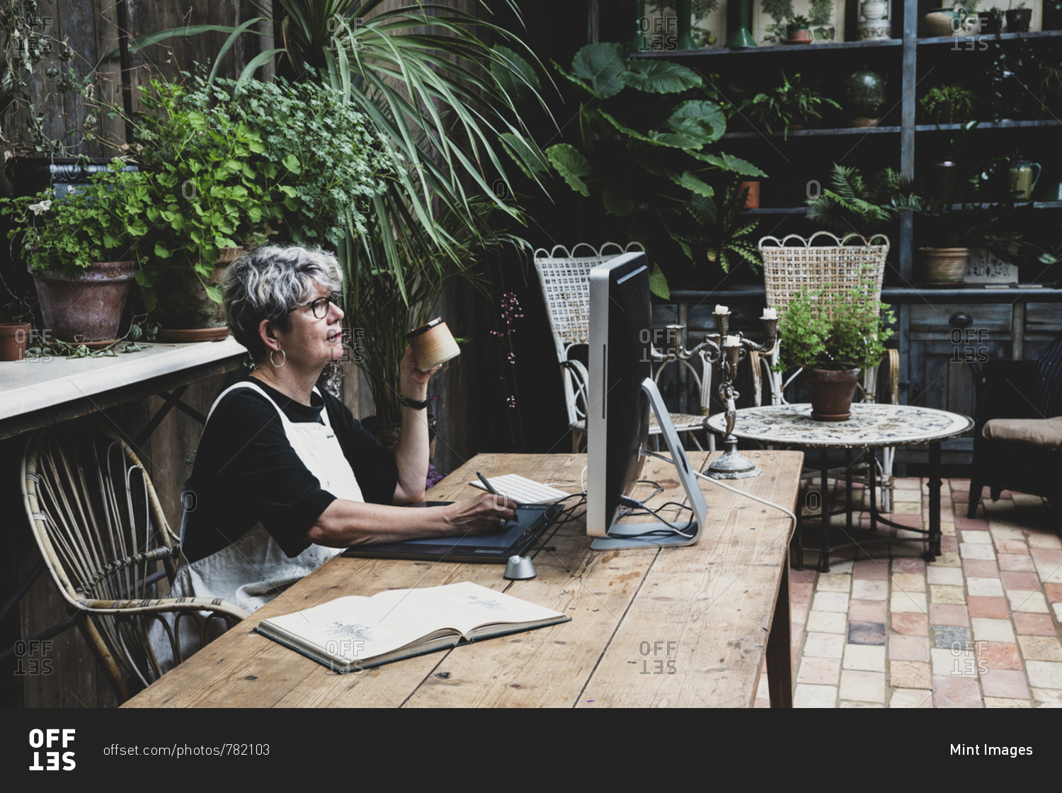Senior woman wearing glasses, black top and white apron sitting at a wooden table, working on desktop computer.