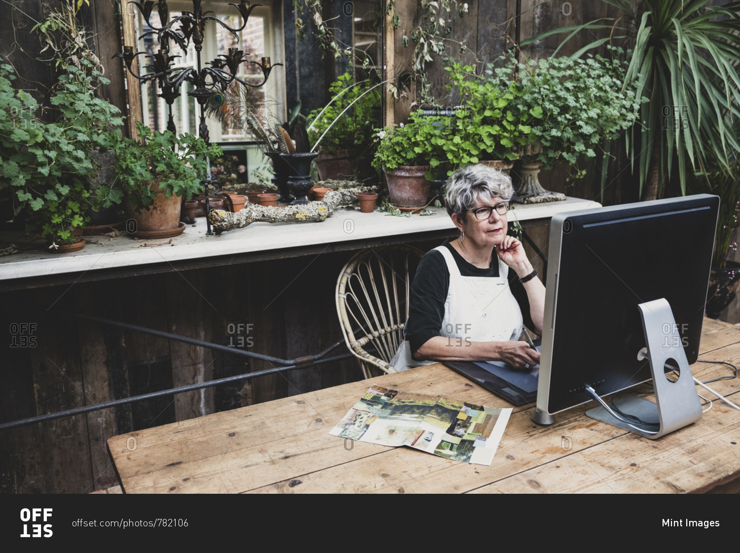 Senior woman wearing glasses, black top and white apron sitting at a wooden table, working on desktop computer.
