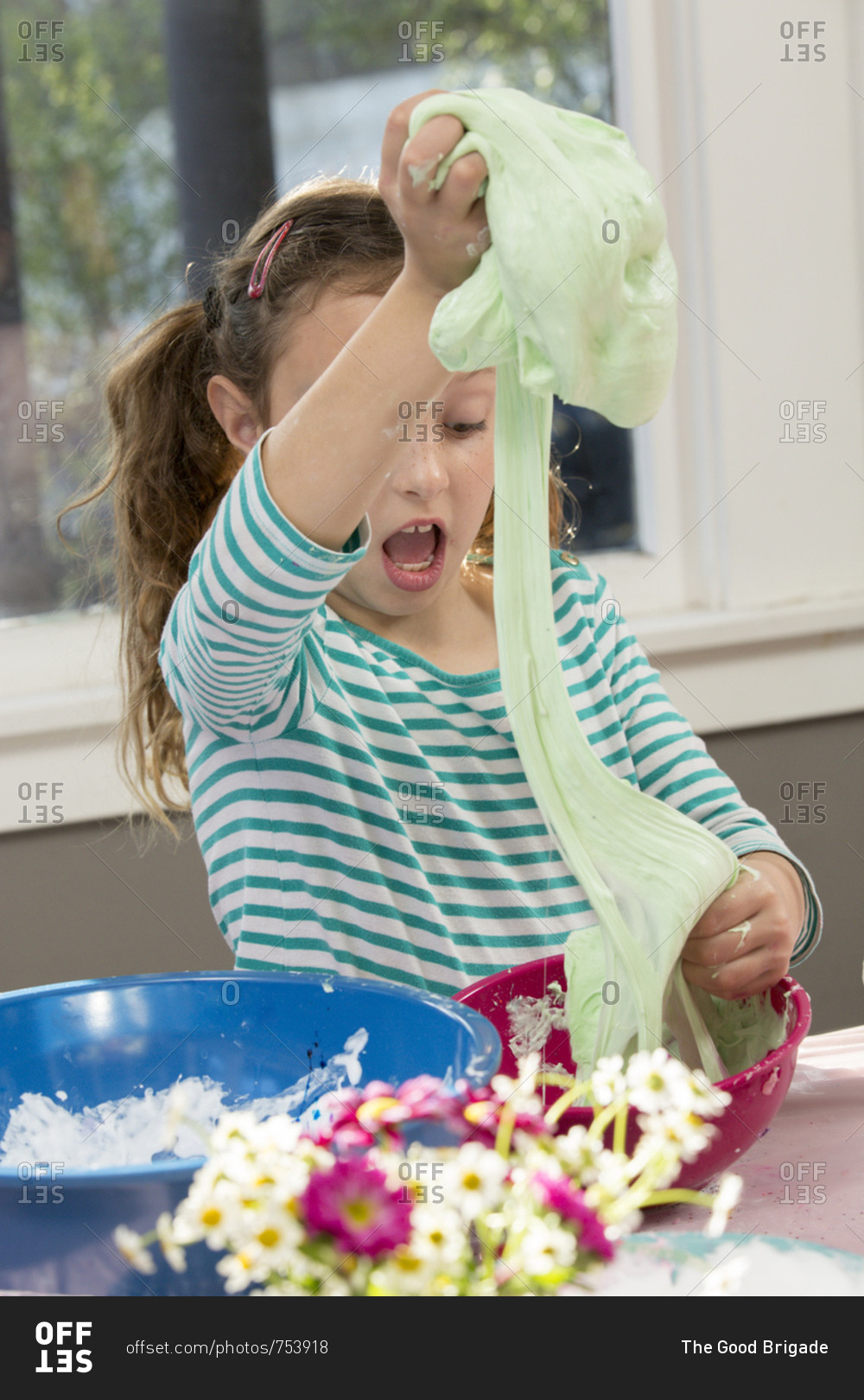 Shocked girl stretching slime from mixing bowl at home