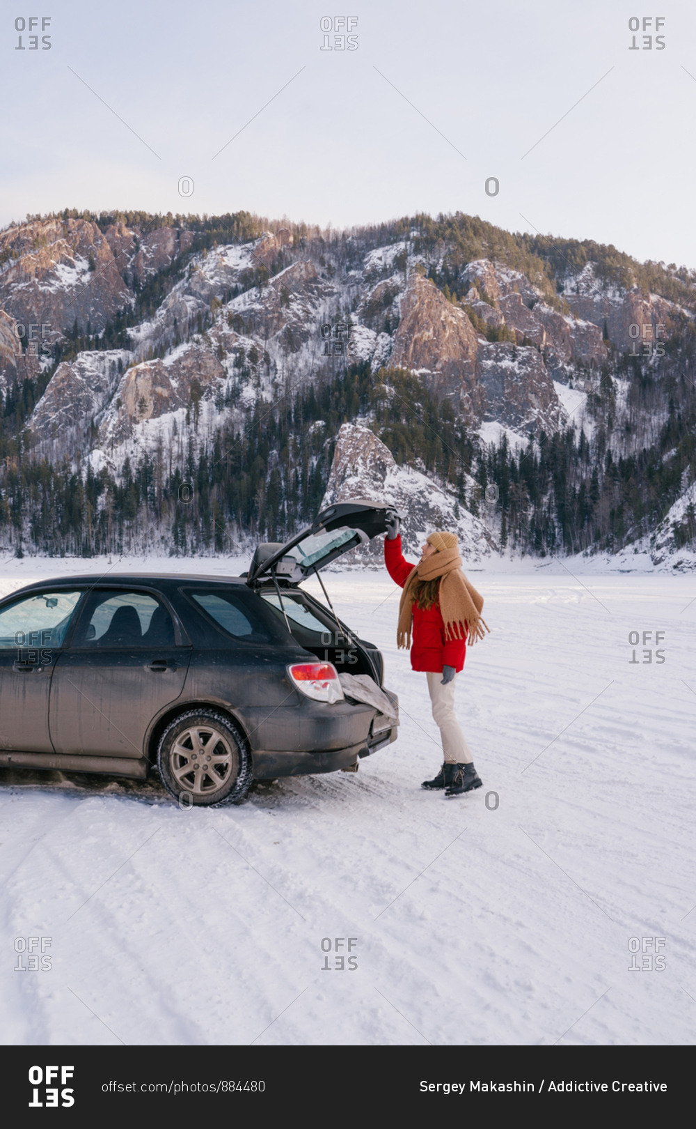 Side view of active woman in warm clothes opening car trunk while standing in snowy valley next to majestic rocks in Siberia Russia