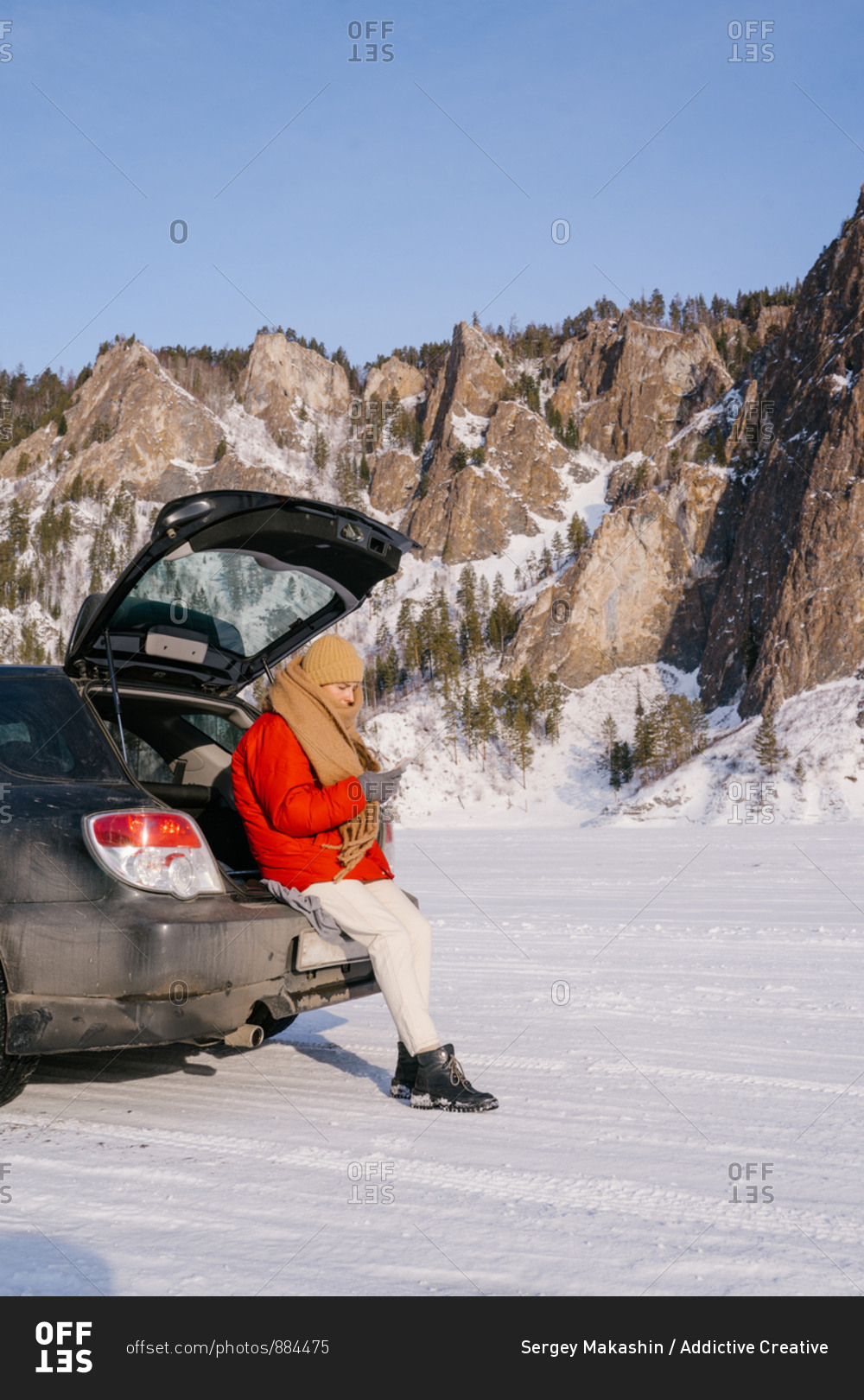 Side view of female in warm active wear sitting on open car trunk and using phone in snowy valley with beautiful rocks during winter road trip in Siberia Russia
