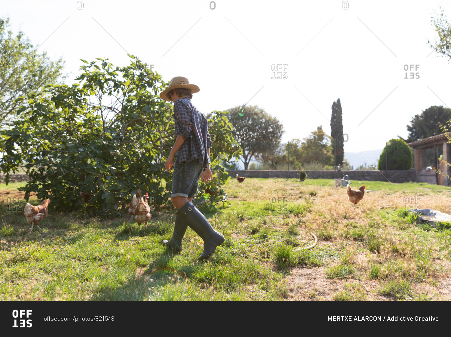 Side view of unrecognizable male teenager in straw hat and high boots walking on lawn near bush while taking care of hens on sunny day on farm