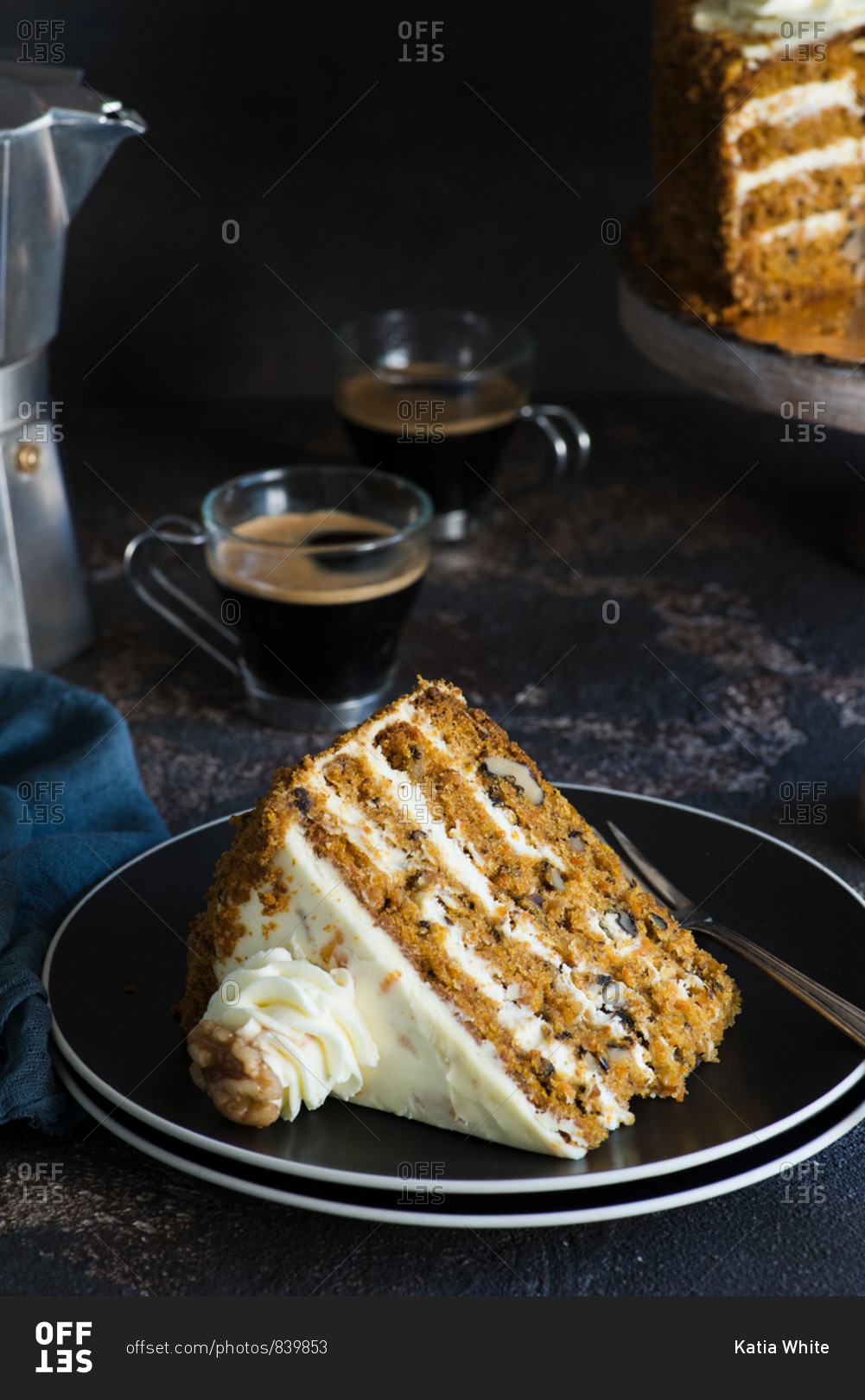 Slice of carrot cake with walnuts on black plate served with coffee