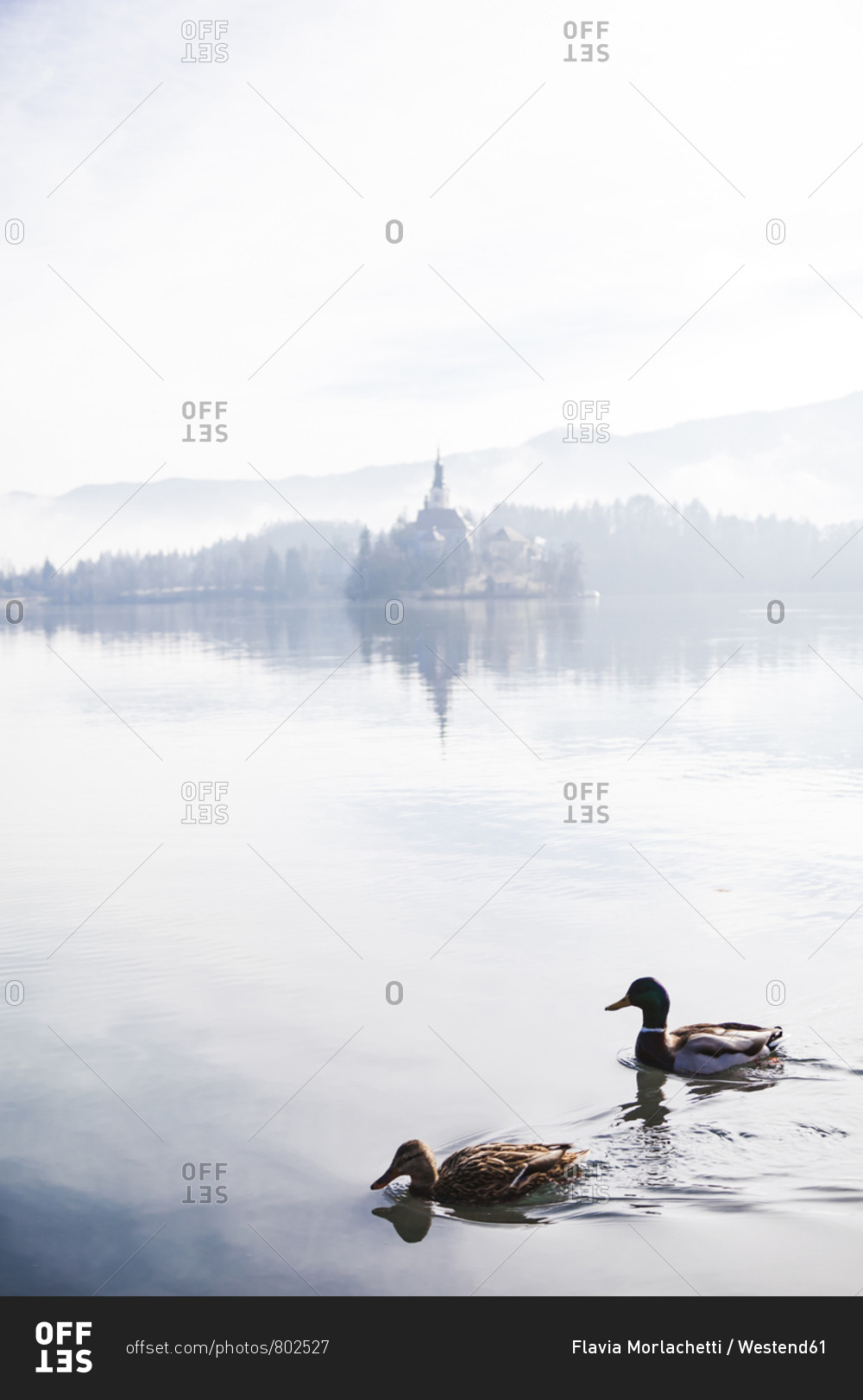 Slovenia- Gorenjska- Bled- couple of Mallard ducks swimming on Bled lake with Bled island behind on a foggy winter morning