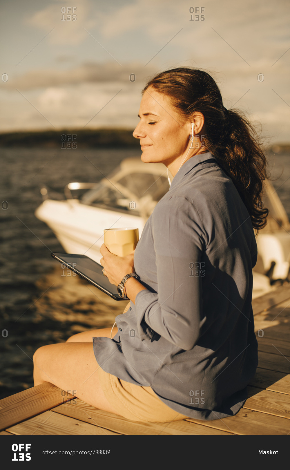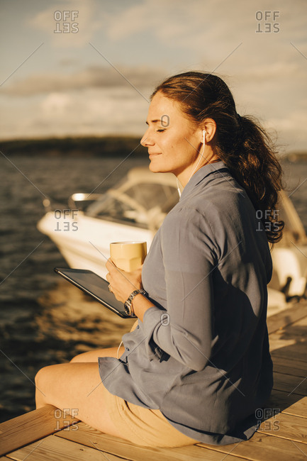 Smiling mature woman having coffee while using digital tablet at patio against lake during vacations
