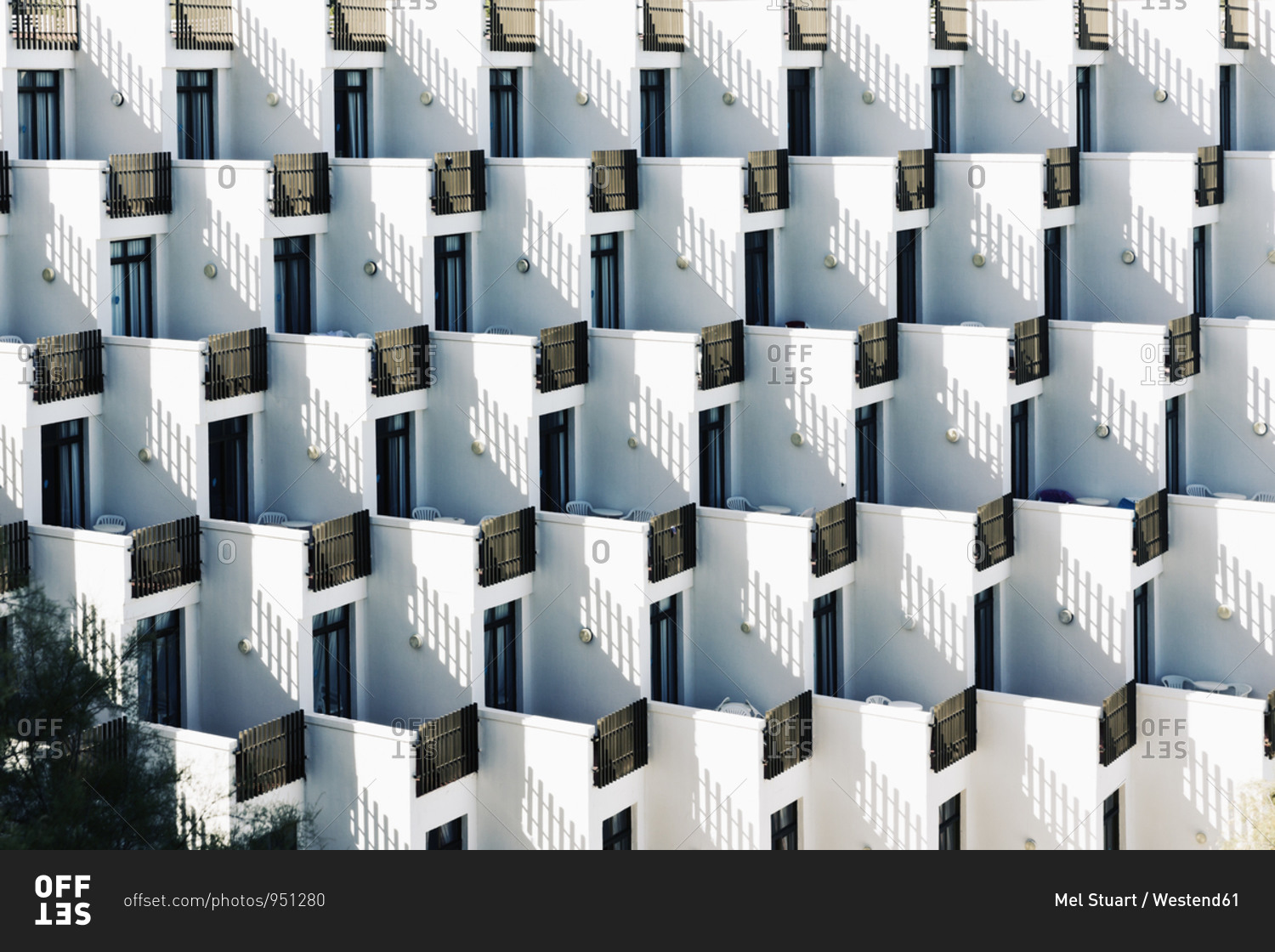 Spain- Baleares- Mallorca- apartment building with rows of balconies