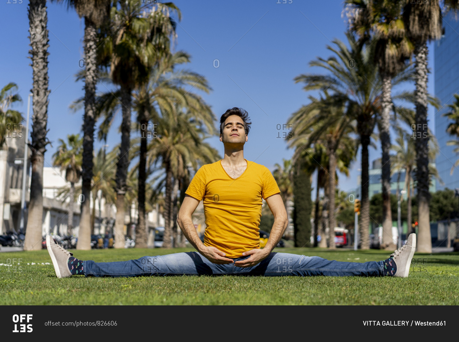 Spain- Barcelona- man practicing yoga on lawn in the city