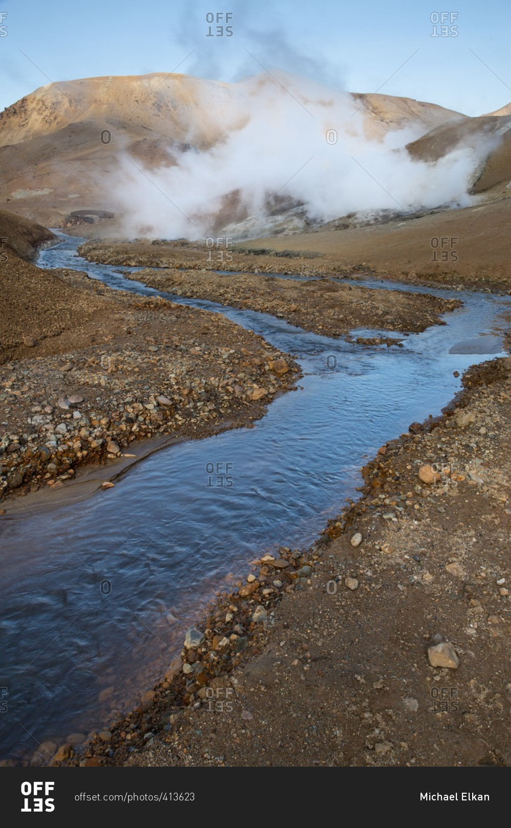 Steam rising along a river in Icelandic geothermal landscape in the remote Kjoslur highlands
