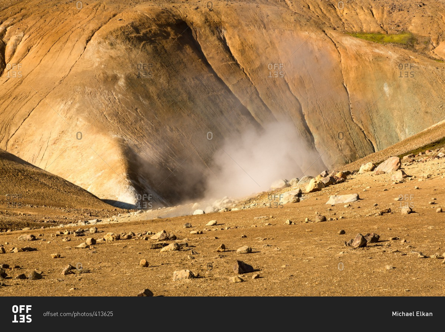 Steam rising in Icelandic geothermal landscape in the remote Kjoslur highlands