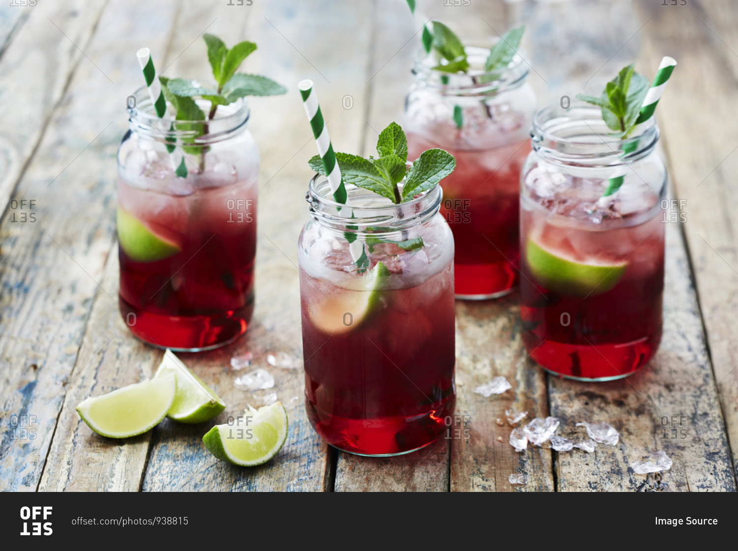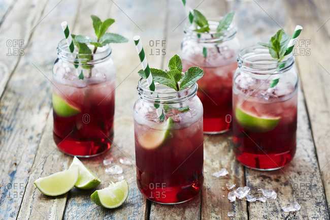 Still life with fruit cocktails in jars with drinking straws