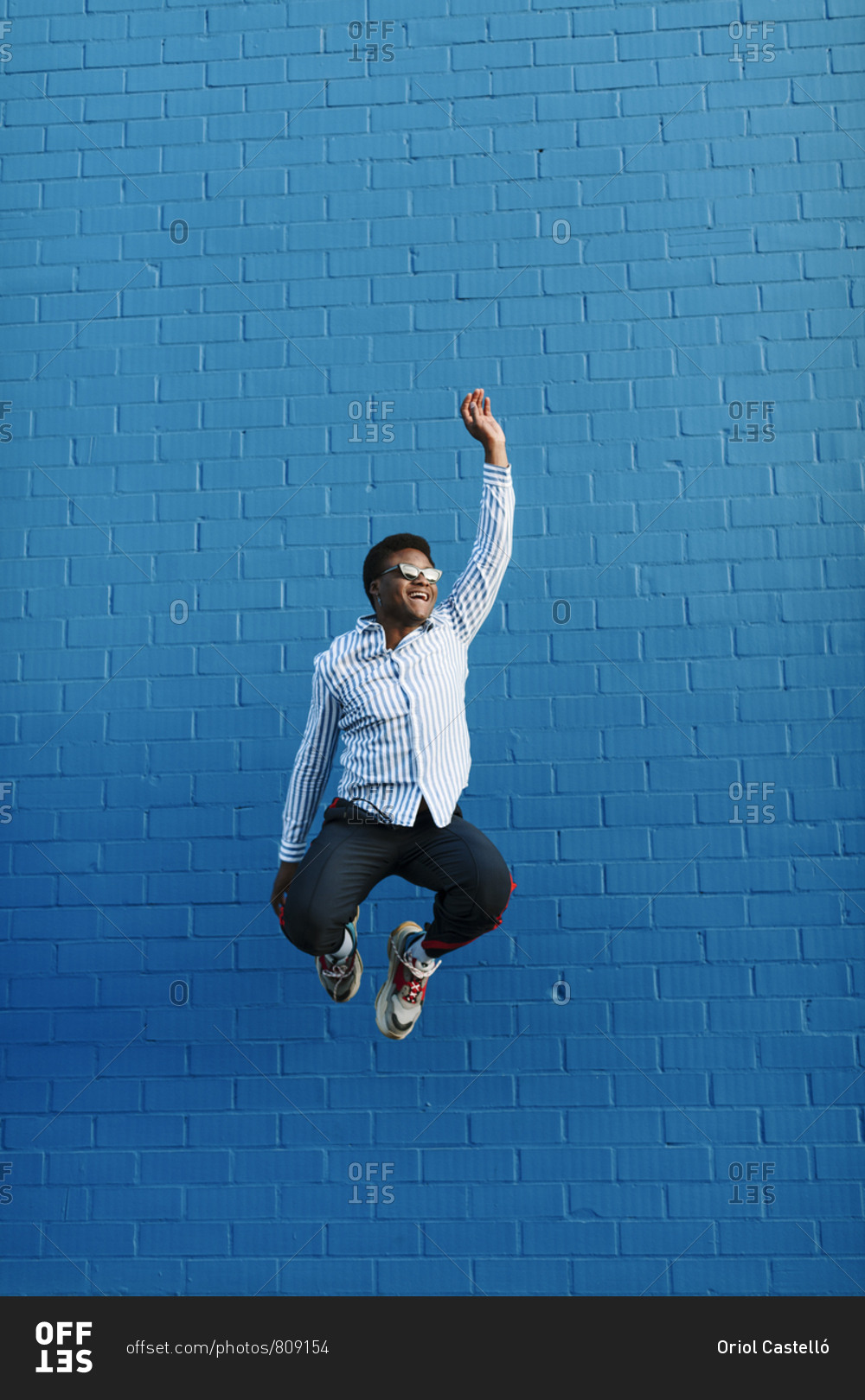 Stylish black man wearing blue striped collared shirt jumping in the air