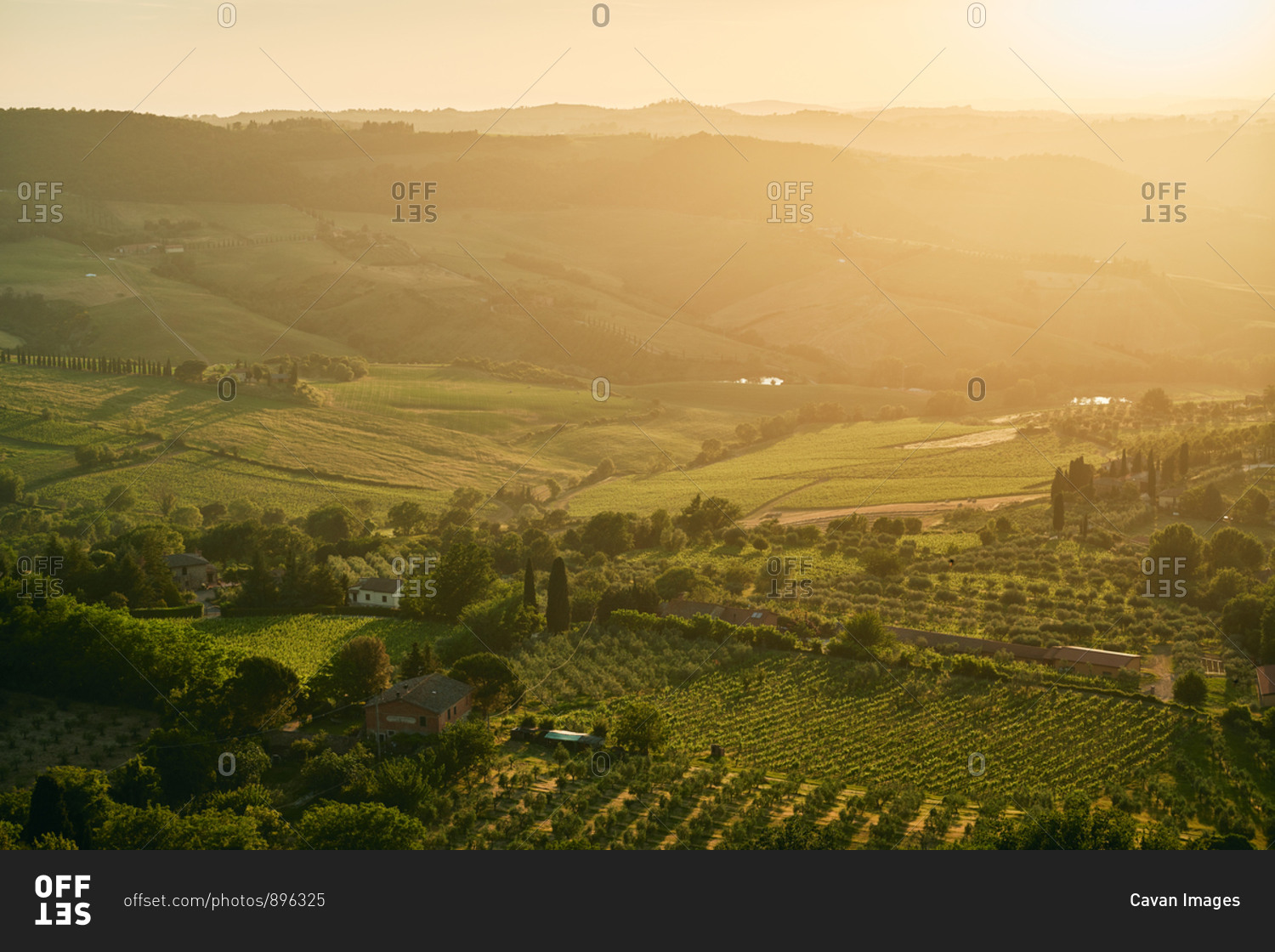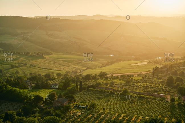 Sunlit farmland and green pastures
