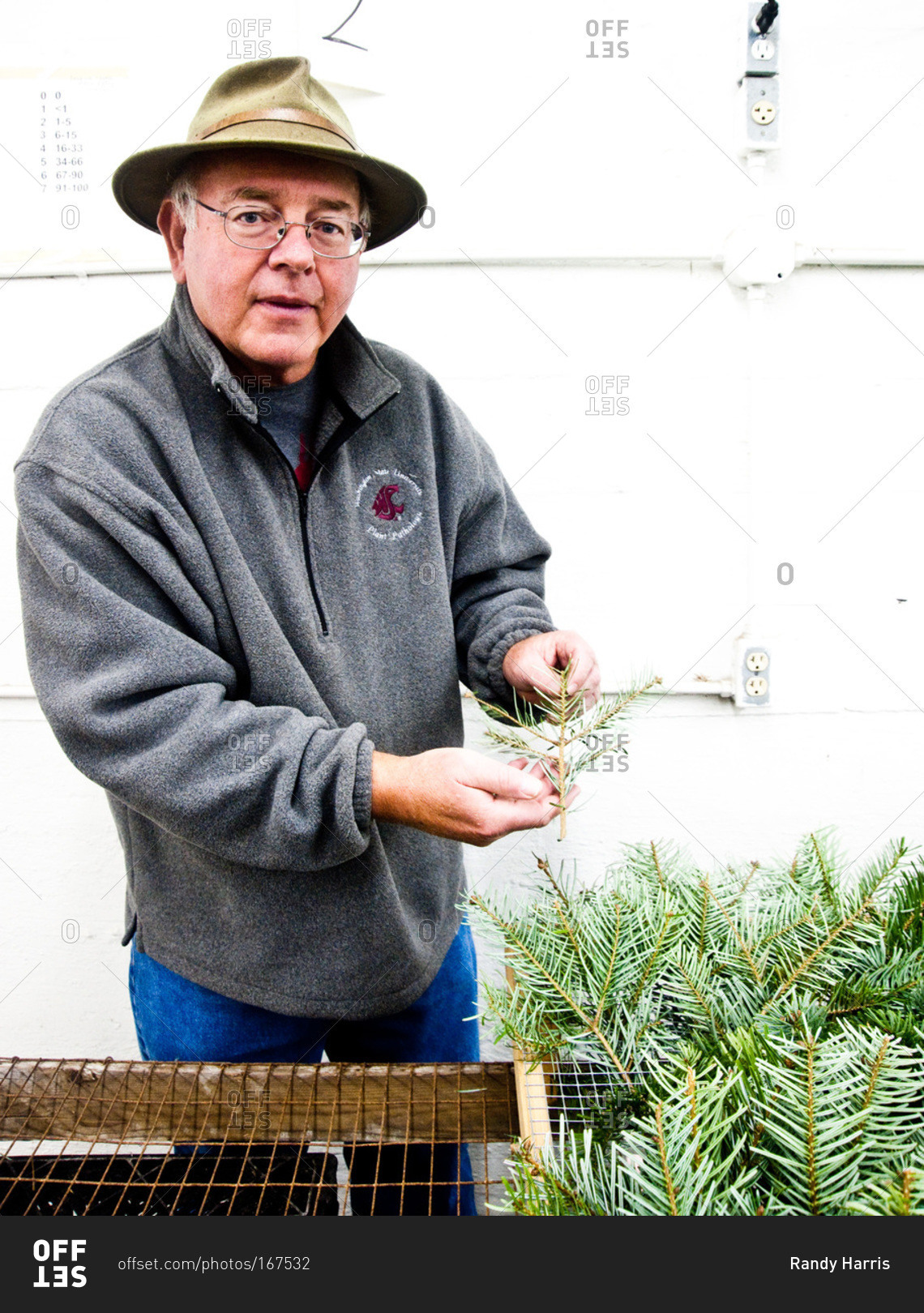 Tacoma, WA, USA - November 15, 2014: Man holding fir samples on a tree farm in Tacoma, WA, USA