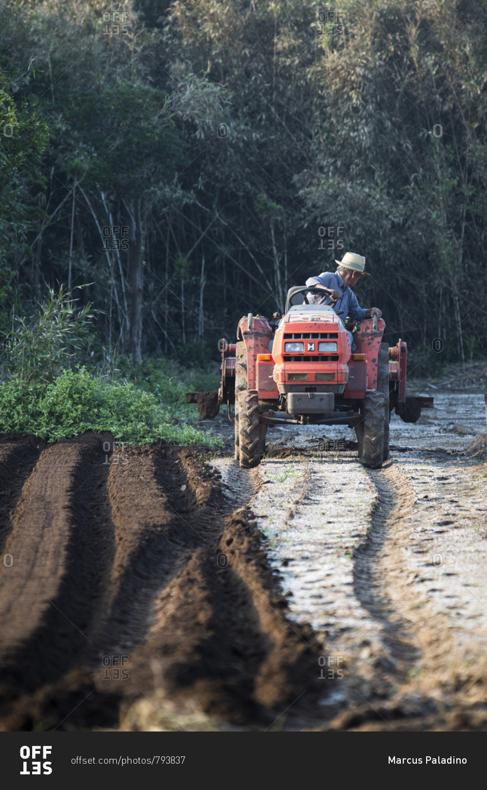 Tahara, Japan - September 16, 2018: Man on tractor working in field