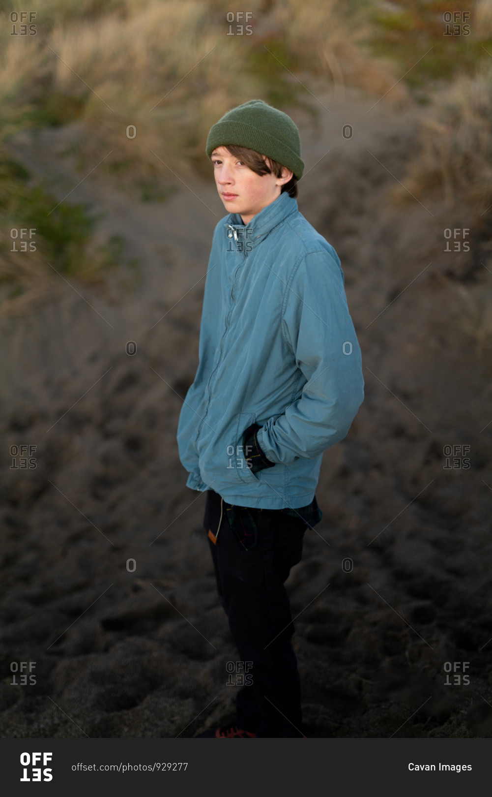 Teenage boy standing at the base of a dune on the coast at twilight